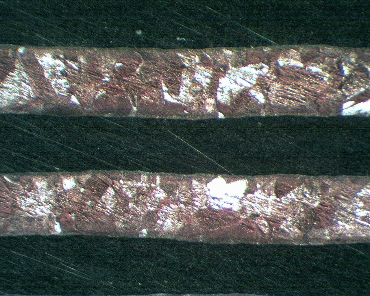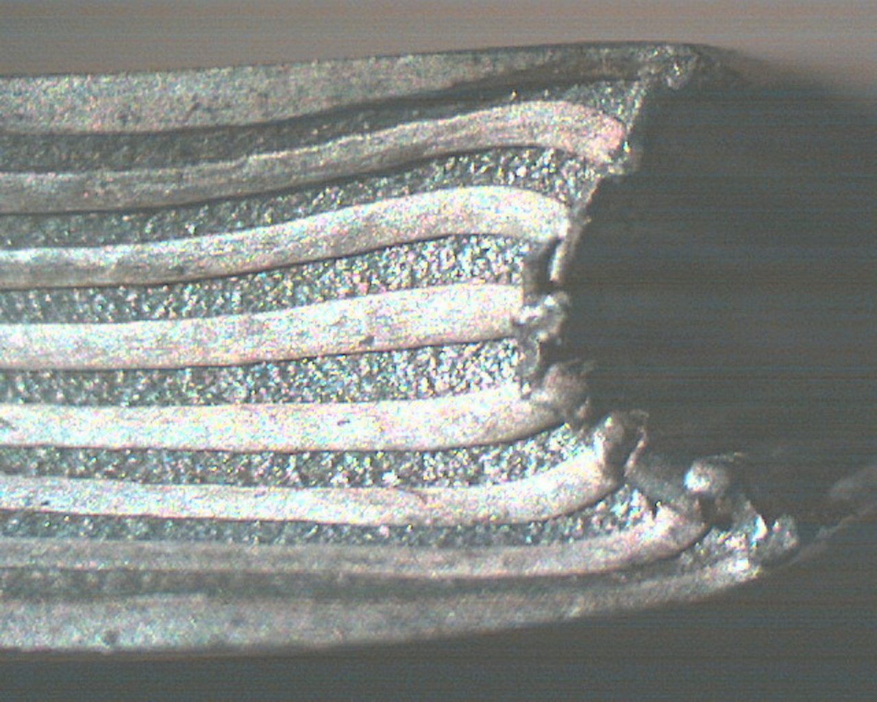 Mit dem blossen Auge oder einer schwachen Vergrösserung sahen die dunklen Stellen tatsächlich wie Risse aus. Bei genauerer Betrachtung durch ein Mikroskop stellten sich die vermeintlichen Risse als schwarze Oxydationen der Silberlagen heraus. Die folgende Abbildung zeigt eine Bruchstelle, welche nicht auf eine Schwäche der Schweisszonen, sondern auf eine Gefügeschwäche einer Lage hinweist.
