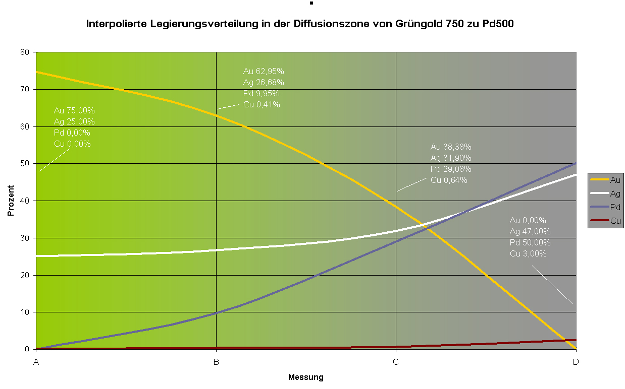 Interpolierte Legierungsverteilung in der Diffusionszone von Grüngold 750 zu Pd500