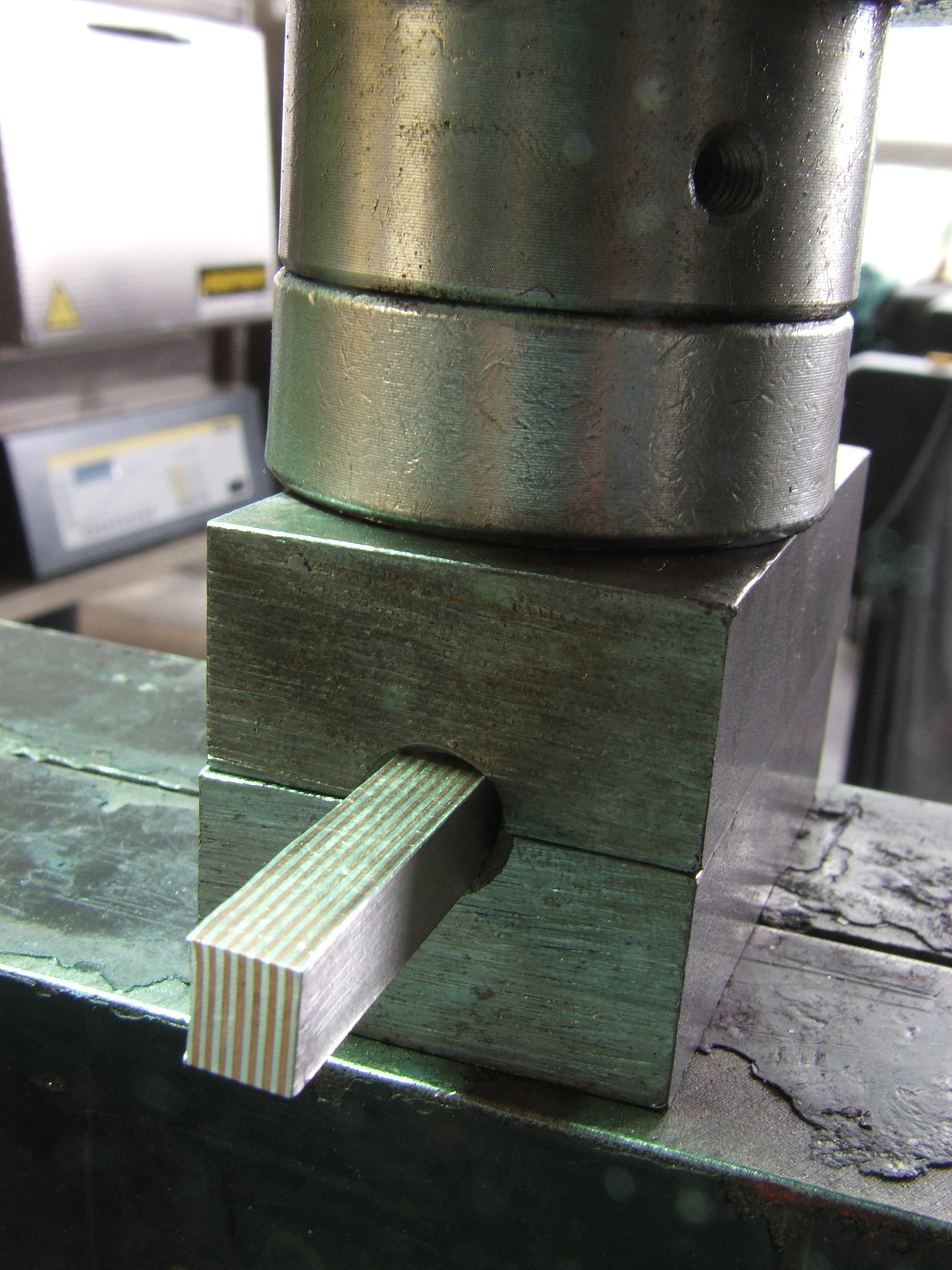 Damit das Modul während der partiellen Bearbeitung keine Einkerbung im Übergangsbereich - von Vierkant- auf Rundprofil - erleidet, ist der "Einlauf" der Anken mit einem Übergangsradius zu versehen. Diese Art des Pressens stellt weitestgehend sicher, dass auch die Kernzonen die für das Glühen notwendige Umformung erfahren. Es ist zusätzlich eine sehr schnelle Umformungstechnik, welche innerhalb weniger Minuten eine gezielte, schonende und weniger anstrengende Bearbeitung selbst kritischster Kombinationen ermöglicht. Mit dieser Technik wird die Gefahr eines Risses im Bereich der Mittellagen durch unzureichende Umformung, wie beim Schmieden mit dem Hammer, deutlich reduziert. Beachten sie, dass die Belastung sogar parallel zum Lagenverlauf ohne Rissbildung erfolgt!