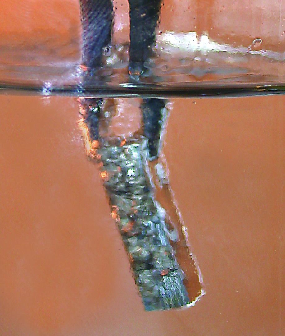 Achten sie auch hier auf hörbare Geräusche (Knistern), welche bereits eine Rissbildung ankündigen. Ein weiteres Indiz für Risse ist oftmals nach dem Abschrecken und dem erneuten Torsionsbeginn zu beobachten. Die beim vorherigen Torsionsprozess entstandenen Mikrorisse füllen sich während des Abschreckens, bedingt durch die Kapillarwirkung, häufig mit Wasser. Beginnen sie nun mit einem weiteren Torsionsgang, kommt es oftmals zu Tropfenbildung entlang der Torsionszone, ähnlich wie beim Auswringen eines Handtuches.