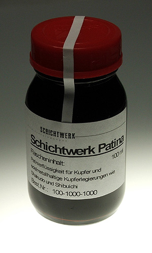 Patinierflüssigkeit für edelmetallhaltige Kupferlegierungen wie Shibuichi und Shakudo. Auch für Kupfer geeignet.